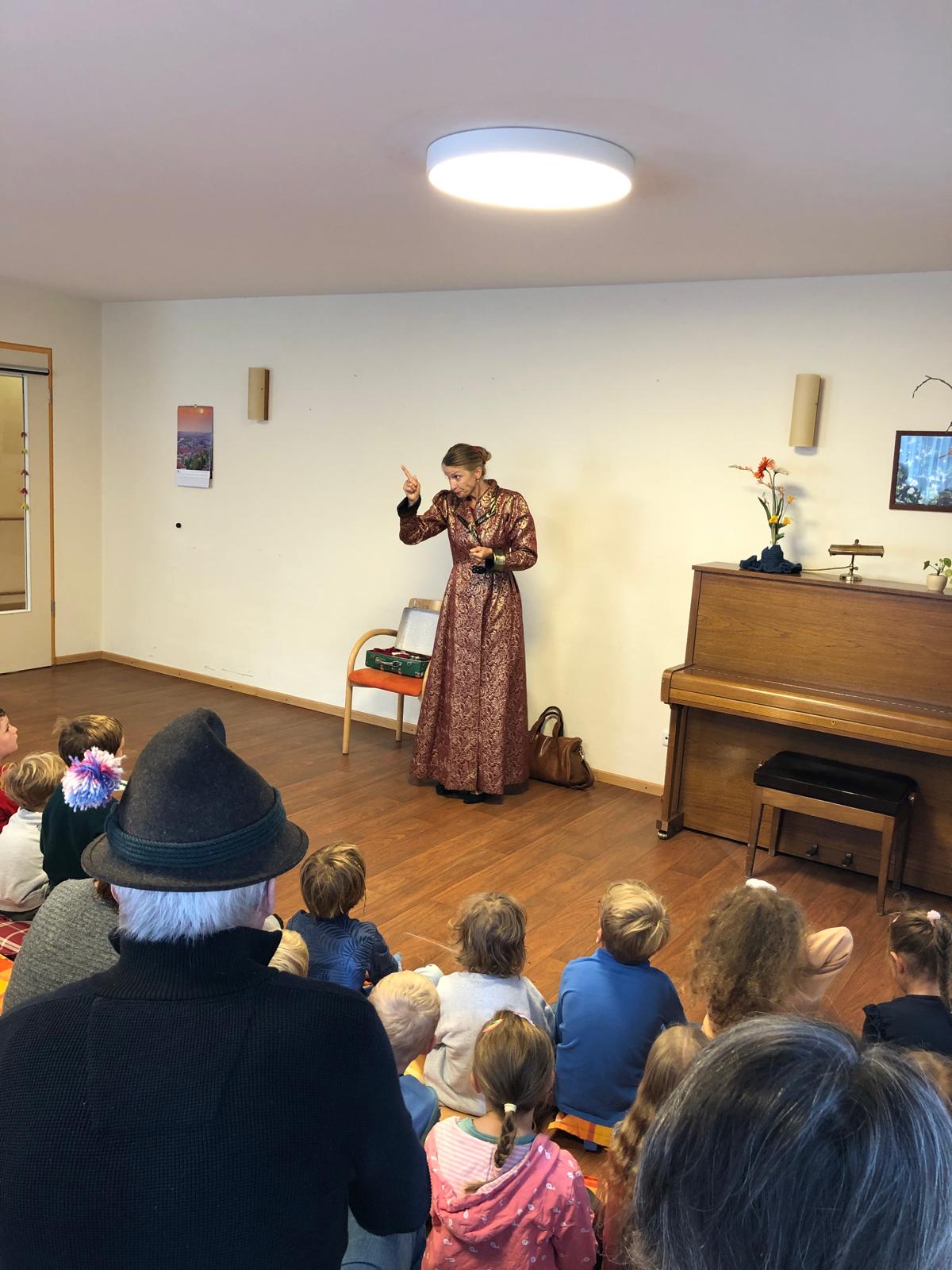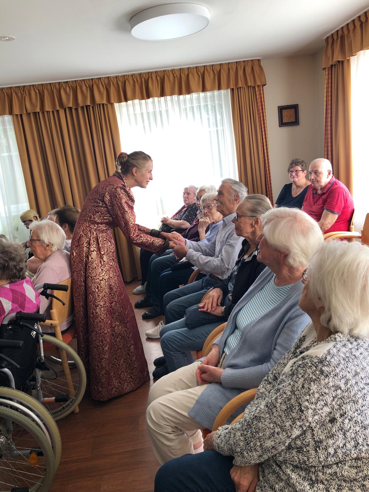 Märchen: eine Welt für sich, voller Zauberwesen, Spannung und Magie. Die Klassiker können das Erinnerungsvermögen aktivieren und bislang verborgene, positive Gefühle wecken. In unserem SenVital startete neulich ein ganz besonderes Projekt. Zu Gast war die professionelle Märchenerzählerin Julia von Maydell von MÄRCHENLAND – Deutsches Zentrum für Märchenkultur gGmbH, die an insgesamt drei Freitagen in unserer Residenz verschiedene Märchen vorträgt. Im Rahmen der kostenlosen Präventionsmaßnahme „Es war einmal … Märchen und Demenz“ in Kooperation mit der AOK Bayern, IKK classic, der Knappschaft und der SVLFG lauschten unsere Senioren gebannt den Geschichten wie „Der Froschkönig“ oder „Schneewittchen“. Auch die Kinder der Kita St. Irmgard folgten unserer Einladung und waren, ebenso wie unsere Gäste, ganz fasziniert von der lebendigen Erzählweise.