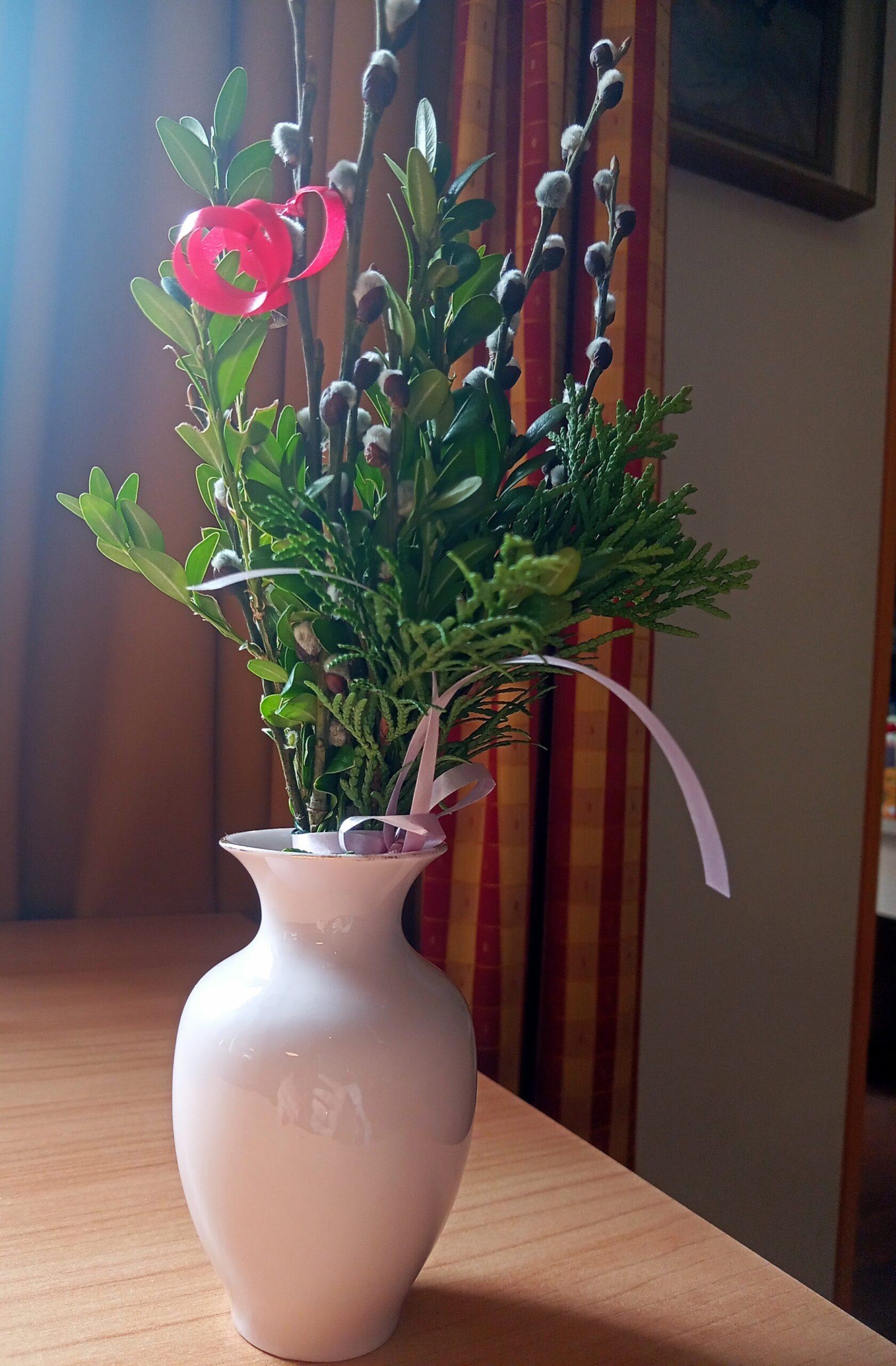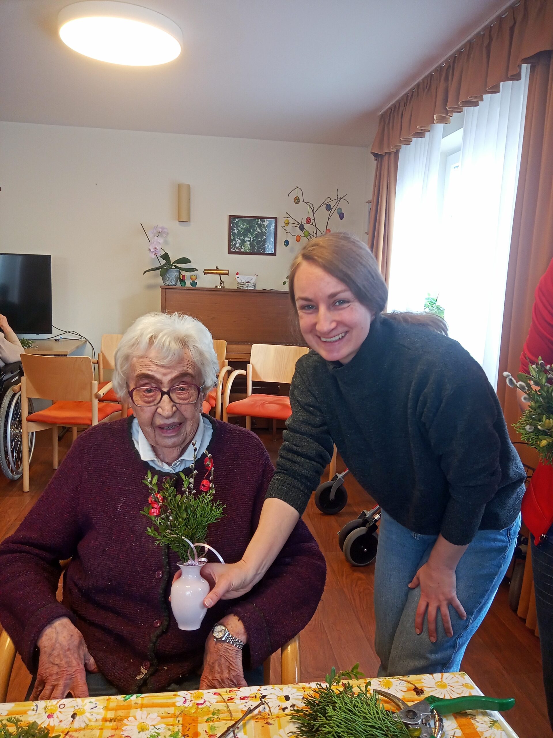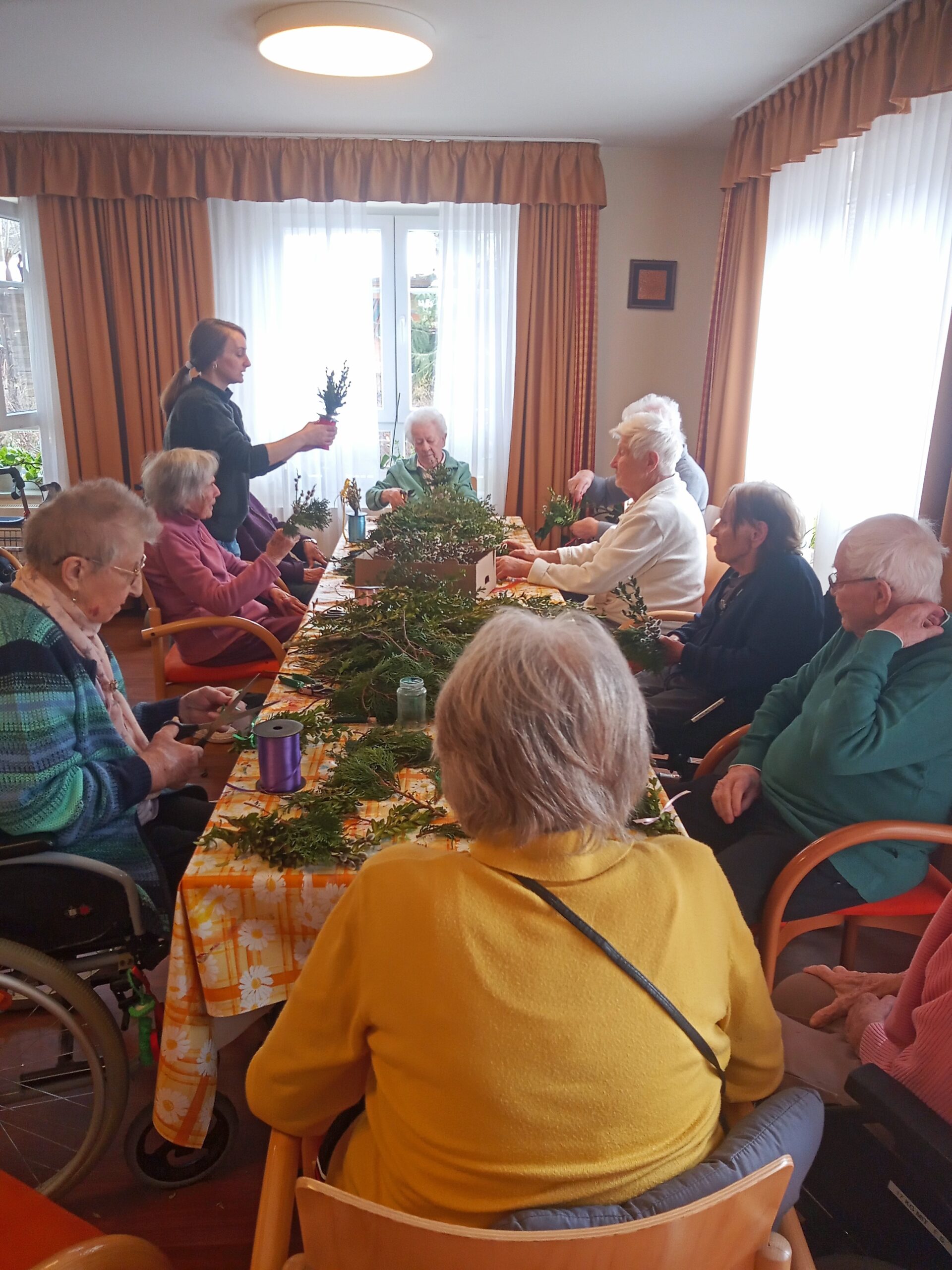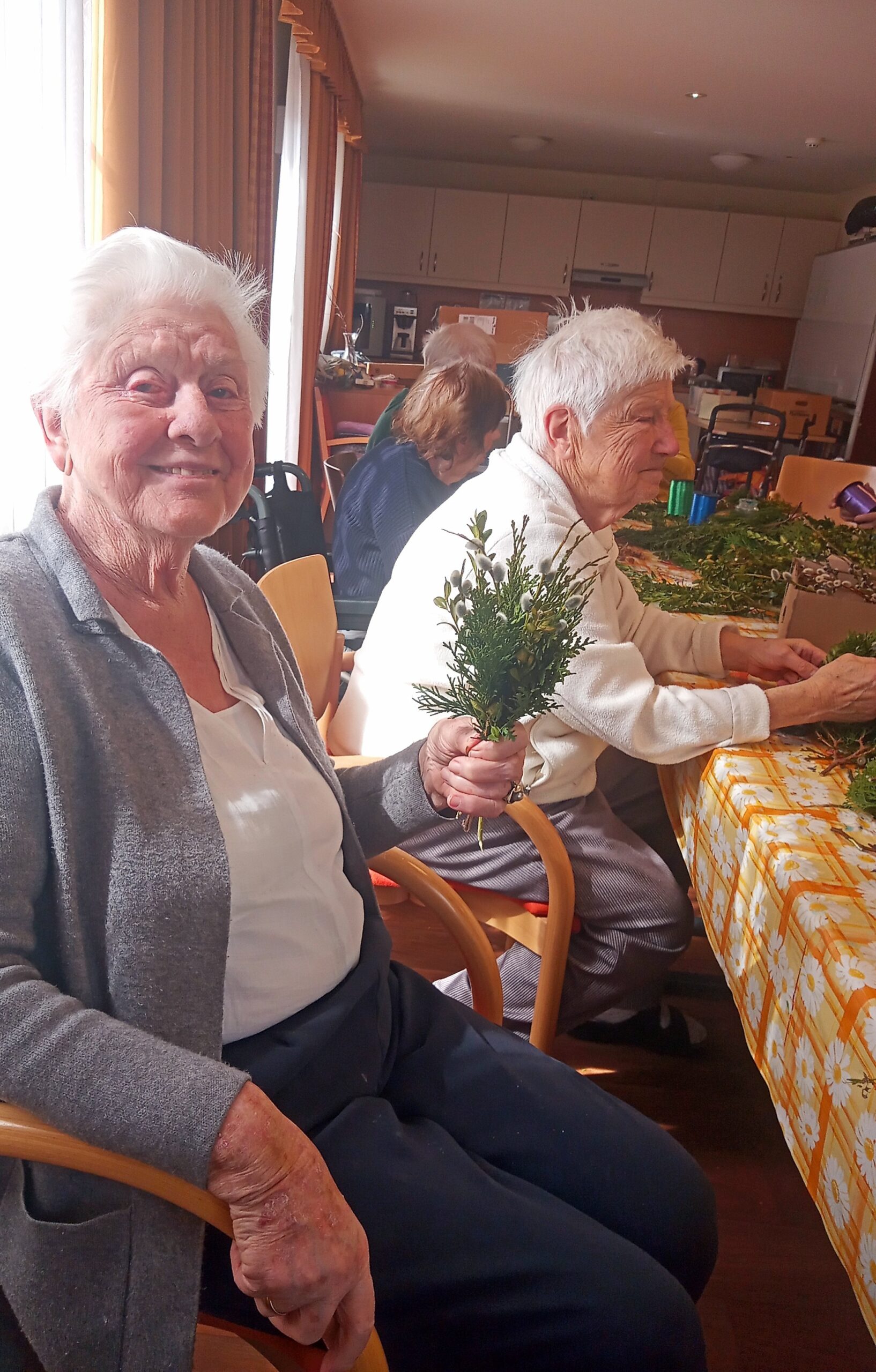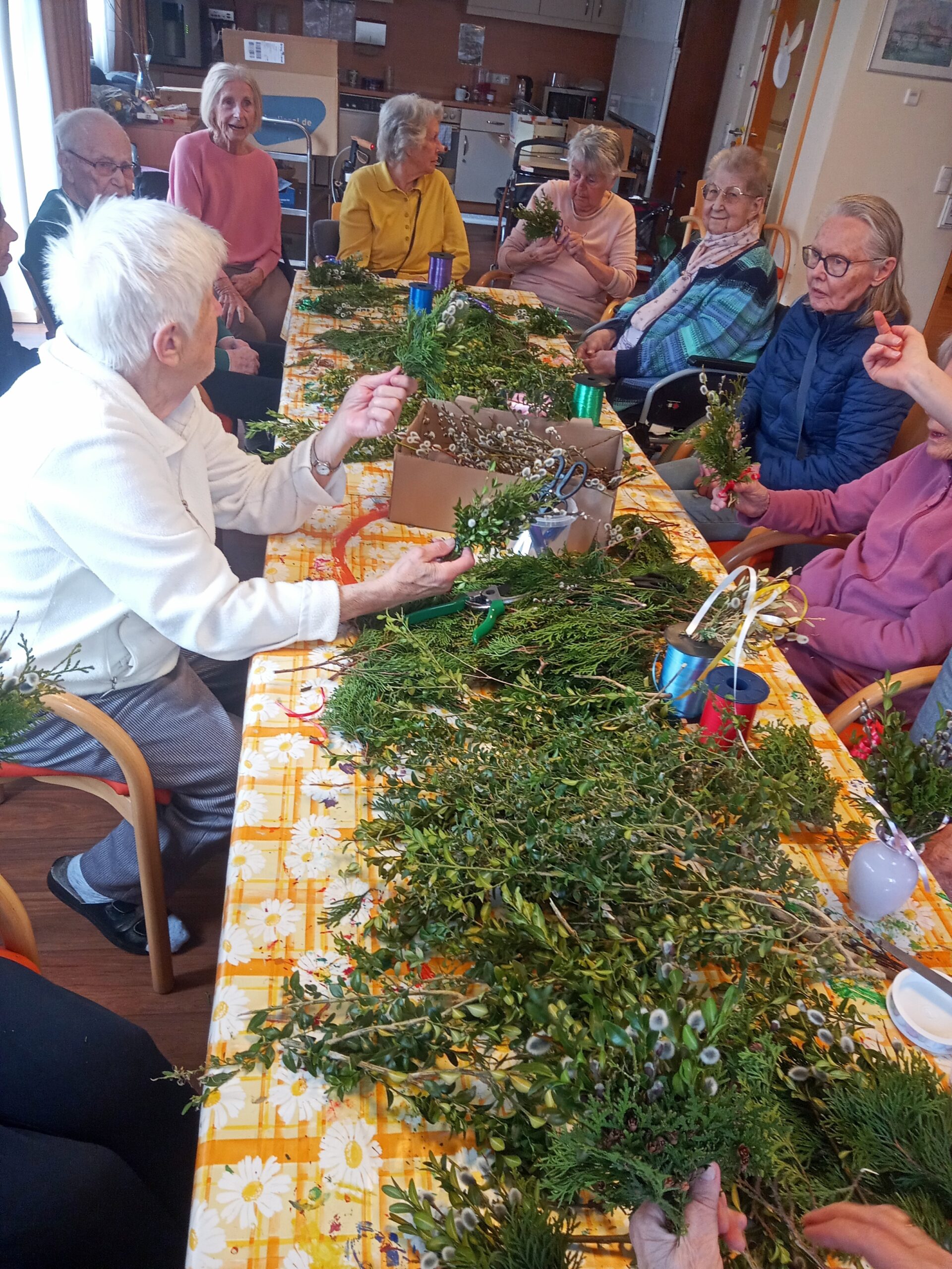 Die Osterzeit ist eine Zeit voller frühlingshafter Bräuche und christlicher Traditionen. Eine davon ist das Palmbuschbinden – also dem Zusammenstellen von immergrünen Zweigen (Weidenkätzchen, Buchsbaum, etc. ) zu einem kleinen Sträußchen, das in der Kirche gesegnet wird und als Schutzsymbol das ganze Jahr über aufgehoben wird. In süddeutschen Gegenden ist dieser Brauch weitverbreitet. Und so hatten auch die Senioren in unserem SenVital viel Freude beim gemeinsamen Binden und Schmücken.